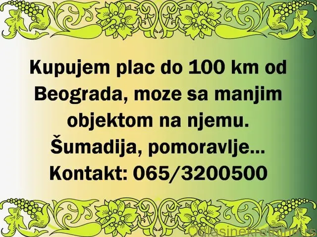 Kupujem plac do 100km od Beograda, moze sa manjim objektom na njemu